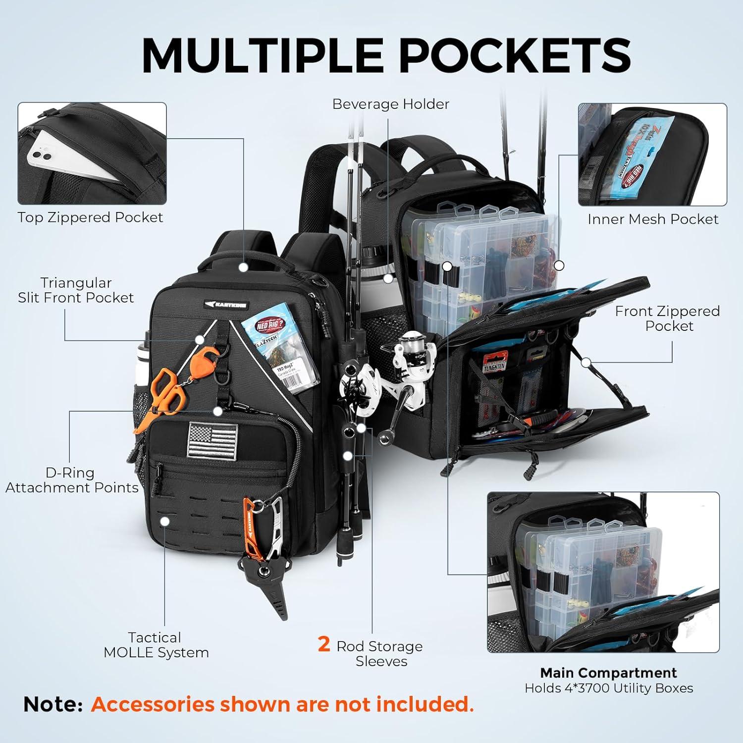 Organize Your Gear – The KastKing KarryAll KastMate Fishing Tackle Backpack offers a smart multi-pocket layout to keep your gear organized. The spacious main compartment fits up to 4*3700-size utility boxes, while an inner mesh pocket holds soft bait bags. A top zippered pocket is ideal for your phone. Additional storage includes a large front zippered pocket, a triangular slit front pocket, 2 rod storage sleeves, a beverage holder, D-ring attachment points, and a MOLLE system.